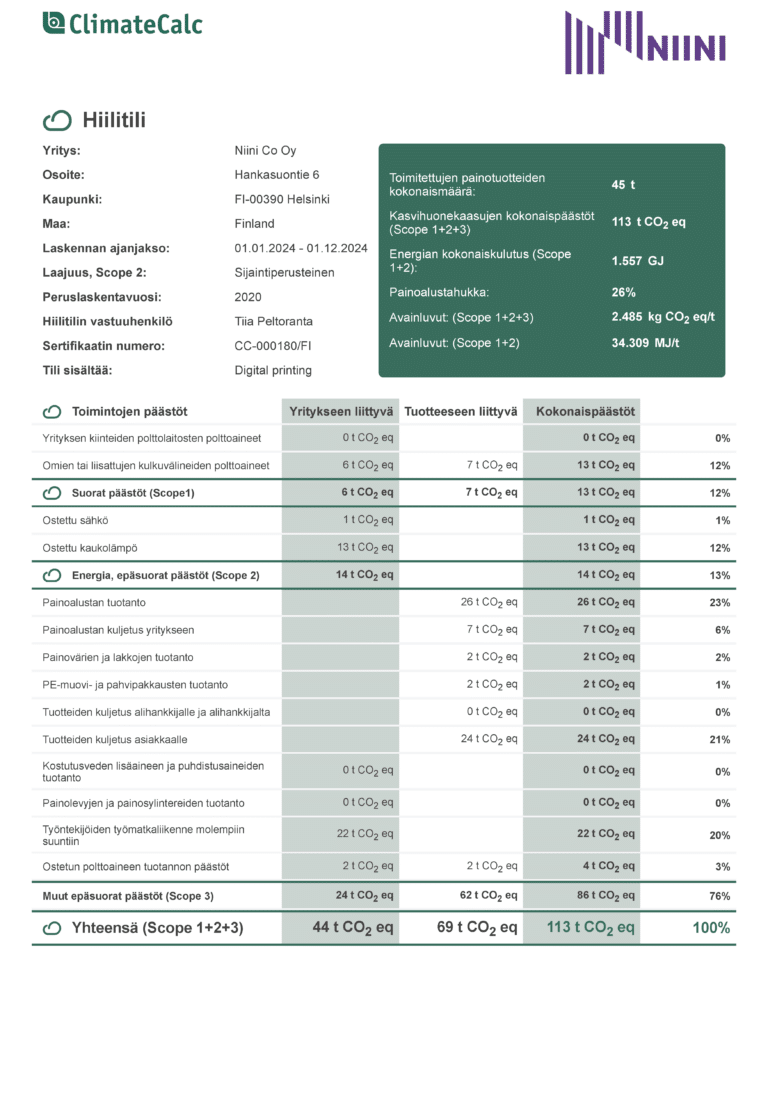 “Asiakkaille on suositeltu ja valittu matalapäästöisempiä vaihtoehtoja, esimerkiksi paperilaatuja, jotka tuottavat vähemmän päästöjä. Näin on saavutettu yli 20 prosentin muutos vuodessa, kun liikevaihdon kehitys otetaan huomioon,” Peltoranta kertoo.