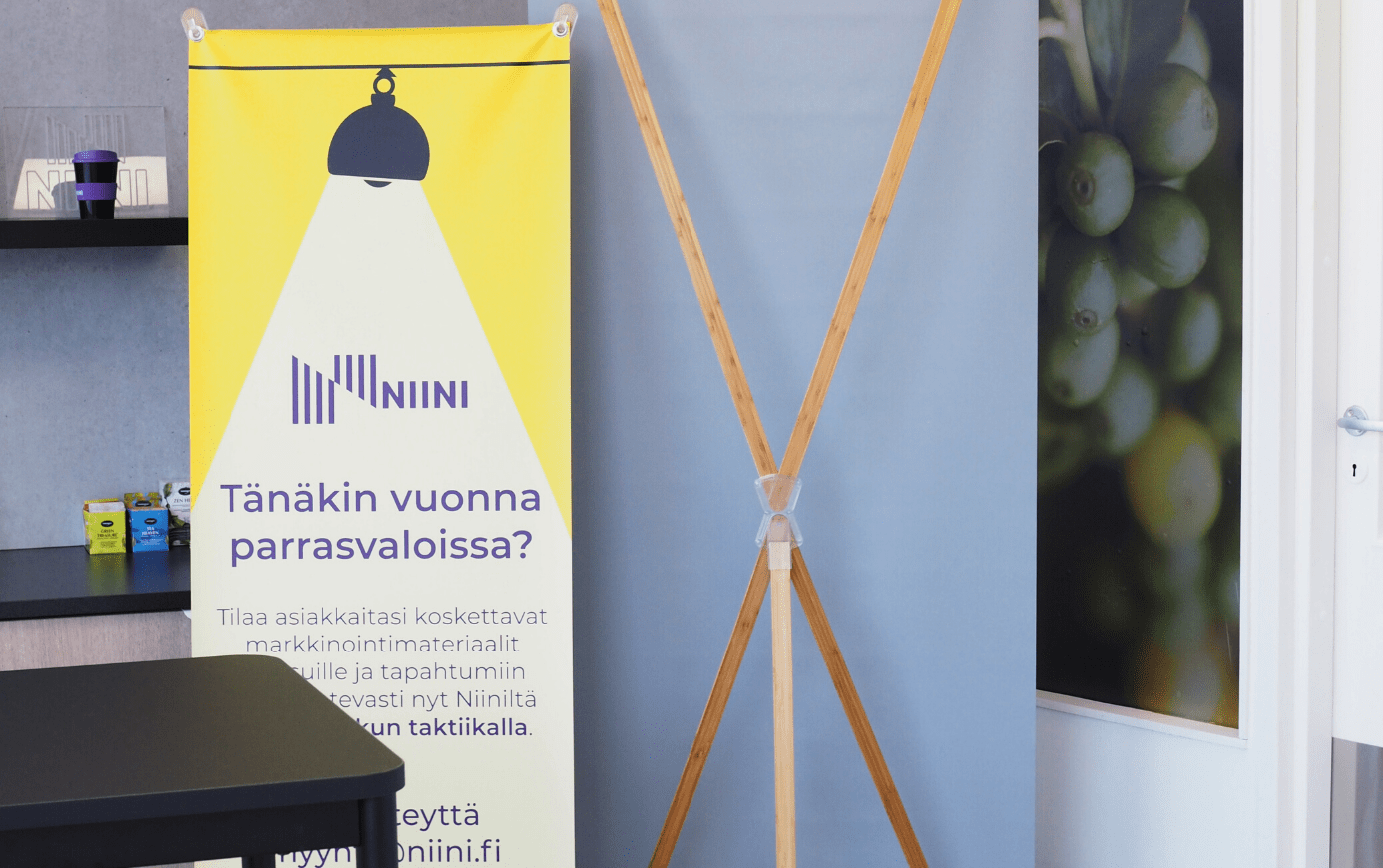 Voit tilata bamburollupin verkkokaupastamme 24/7. Lataat vain valmiin rollup-aineiston valmiiseen suunnittelupohjaan, ja tilaat sen nopeasti ja helposti verkosta