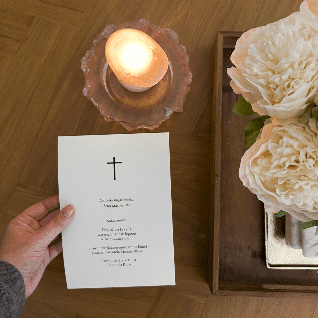 Hautajaiskutsut painetaan laadukkaasti ja toimitetaan nopeasti, jotta sinulla on yksi huoli vähemmän surun hetkellä.