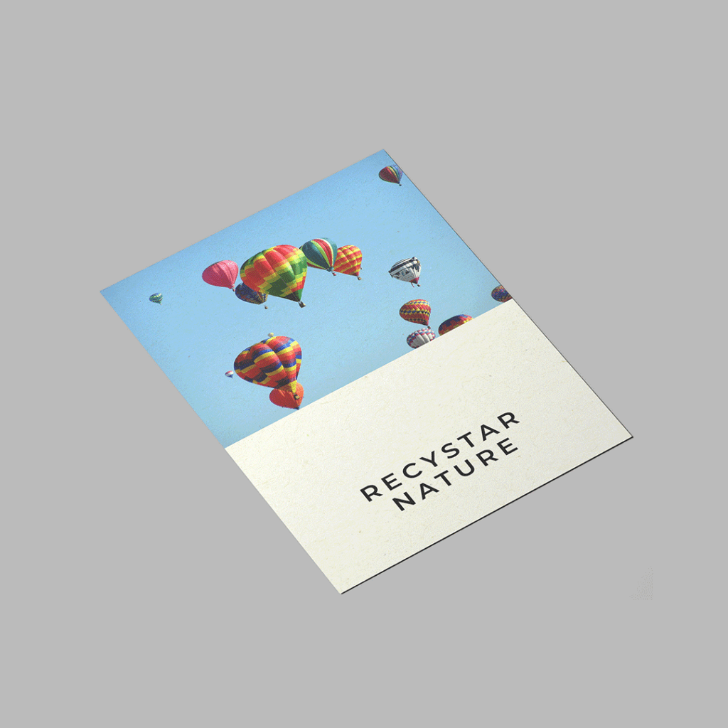 – RecyStar Nature 300g Kierrätyspaperi Recystar on sävyltään aavistuksen kellertävä ja hienovaraisesti harmaaseen taittava, mikä antaa painotuotteelle pehmeän, luonnollisen ilmeen. Pinnassa näkyvät pienet kierrätyskuidut tuovat materiaaliin elävyyttä ja aidon, vastuullisen tuntuman. Värit toistuvat maltillisesti ja lämpimästi, mikä sopii erityisesti brändeille ja viesteille, joissa halutaan korostaa ekologisuutta, aitoutta ja maanläheistä estetiikkaa. Recystar on erinomainen valinta esimerkiksi esitteisiin, kortteihin ja kansiin, joissa materiaalin luonne saa näkyä osana kokonaisilmettä.