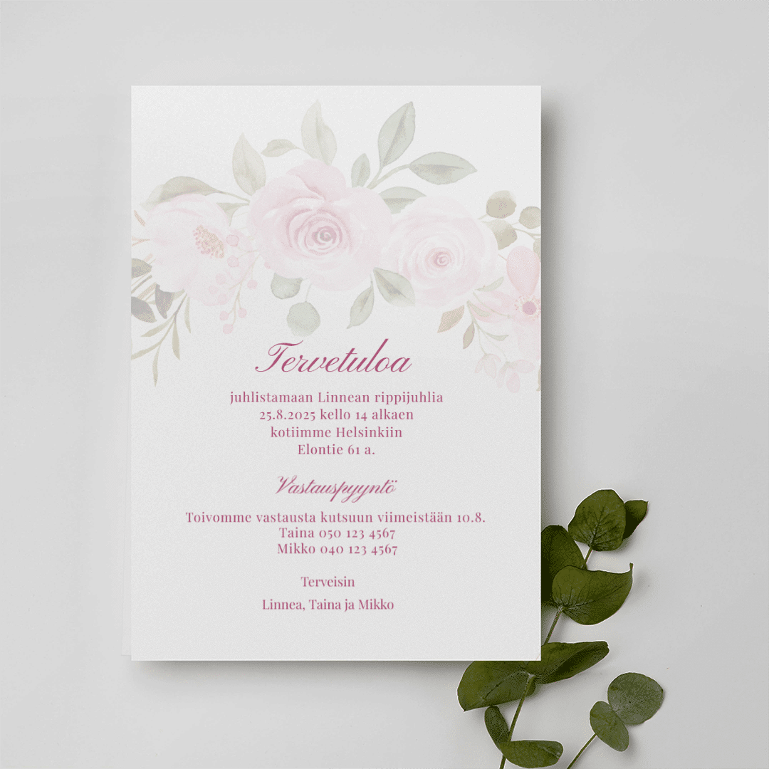 Lataa valmis aineistosi tai suunnittele oma rippijuhlakutsu A5 verkkokauppamme suunnittelutyökalulla.