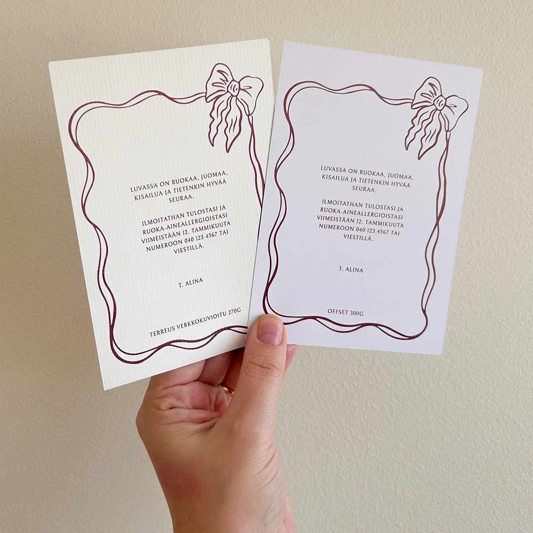 A6 on klassinen ja suosittu koko kutsukorteille – kompakti, mutta riittävä kaiken tarvittavan tiedon esittämiseen tyylillä.