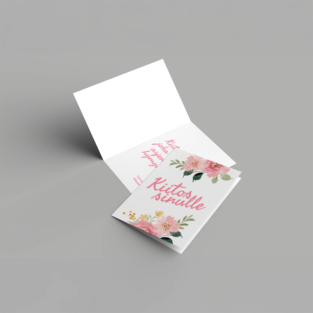 Taitettu A7-kortti on kompakti mutta monipuolinen painotuote, kun viestille halutaan hieman enemmän tilaa ilman, että kortti kasvaa kooltaan suureksi. Taitto tuo korttiin ryhtiä ja tekee siitä juhlavamman vaihtoehdon esimerkiksi kiitoskorteiksi, kukkakauppojen korteiksi, onnitteluihin ja pieniin kutsuihin. Kortti on helppo antaa kädestä käteen, sujauttaa kukkakimpun tai lahjan mukaan ja lähettää kirjekuoressa.