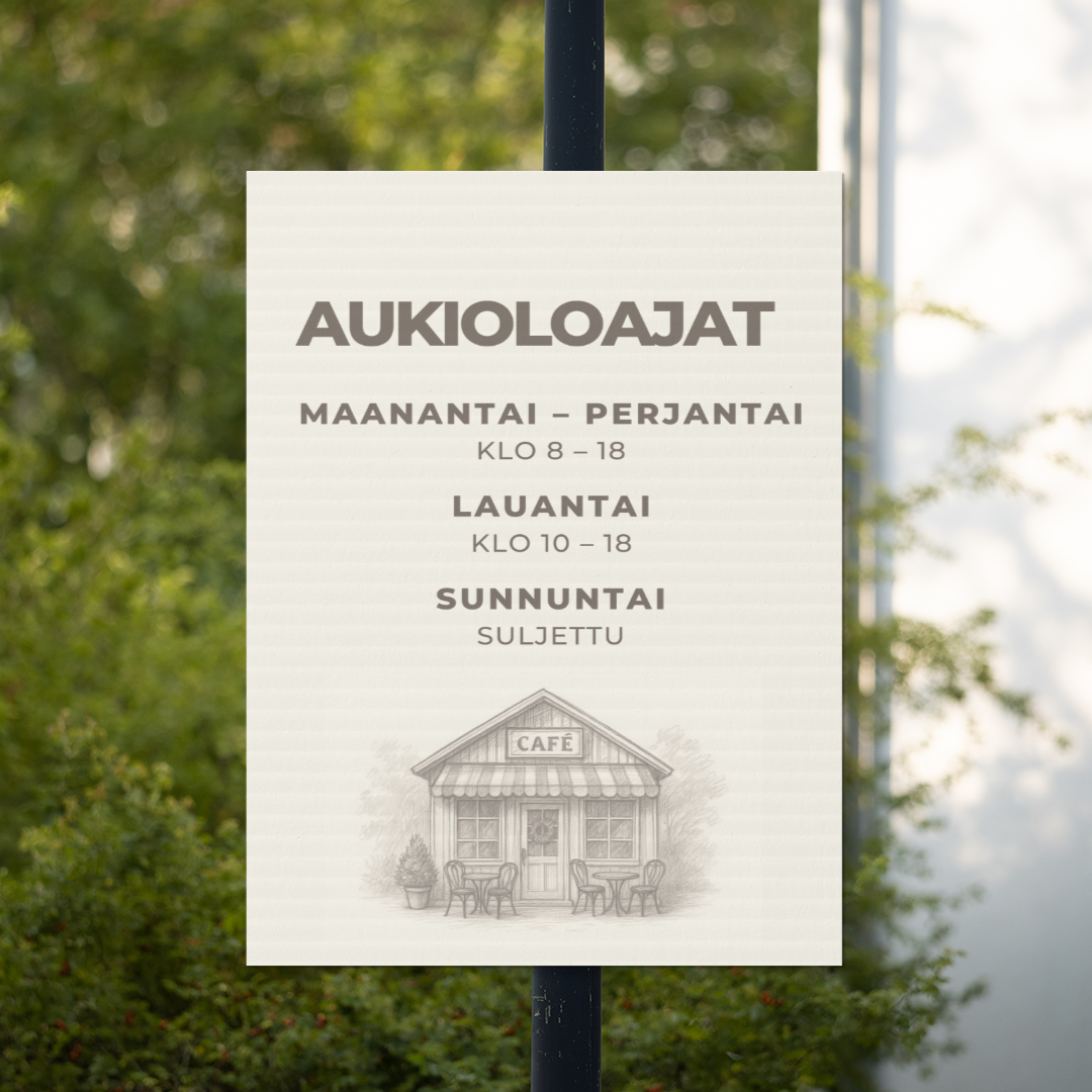 Suunnittele kyltti brändin visuaalisen ilmeen mukaiseksi: lisää logo, slogan, värit ja selkeä viesti, joka houkuttelee ohikulkijat pysähtymään. Voit valita kyltteihin nuolia, symboleja tai muita ohjauselementtejä, jotka tekevät viestistä nopeasti ymmärrettävän myös liikenteen seassa. Soveltuu sisäänkäyntien yhteyteen, teiden varsille, rakennustyömaille tai messualueille.